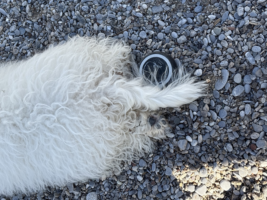 An overhead photograph captures the posterior section of a large, white, long-haired dog resting on a ground composed of numerous small, rounded, grey and white pebbles. The dog's thick, curly white fur dominates the central portion of the image. Its bushy white tail extends towards the lower right, and one hind paw, with visible dark paw pads, is partially visible near the base of the tail. Adjacent to the dog's tail, a small, dark-colored circular object with a light-colored graphic or text, partially legible as "Power", rests on the pebble surface. The scene is illuminated by natural light, casting subtle shadows on the left side of the frame. The location is in the city of Prijevor, Montenegro.