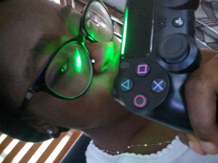 A close-up image taken in Ado, Nigeria, features a person with dark skin, partially visible from the nose upwards and to the left shoulder. They are wearing dark-framed glasses that exhibit a prominent green reflection, originating from a PlayStation DualShock 4 controller held in their right hand. The controller's light bar emits a bright green glow, illuminating the lower part of the person's face, specifically below their nose and their chin, and strongly reflecting off the inner surfaces of the eyeglass lenses. The person wears a light-colored garment with a scalloped edge visible on the left shoulder and a thin, gold-colored chain around their neck. A small, light-colored stud earring is present in their left ear. The background shows blurry vertical slats on the left, possibly blinds, and a patterned fabric item on the right.