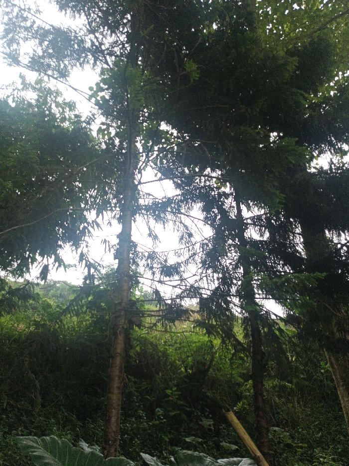 Tall trees reach towards a bright, overcast sky. Dense foliage obscures much of the upper portion. A steep, green hillside is visible between the trunks. The trees' bark is textured and a mix of brown and gray tones. Overgrowth fills the lower area. Some leaves at the bottom are very big.