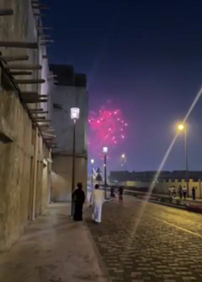 narrow cobblestone street with old, weathered buildings on the left and a distant fence with people along the right edge. Street lamps illuminate the path. In the distance, a fireworks display paints the night sky with bursts of pink, red, and white light. Two people, one in a black abaya and the other in a white thobe, are walking down the street, away from the viewer and towards the fireworks. A person on a scooter passes in the same direction. The sky is a deep blue, hinting at either dawn or dusk.