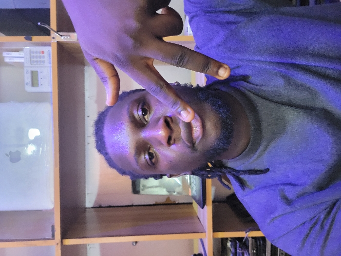 A dark-skinned man with dreadlocks and a beard poses indoors, giving a hand gesture