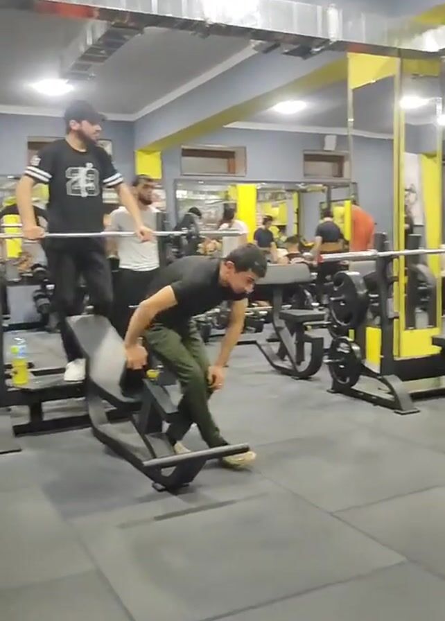 interior of a gym, likely a commercial fitness center. Several individuals are working out on various weightlifting machines and benches. In the initial frame, a man in a black t-shirt and olive-green pants is getting off a bench press, and he is assisted by another man standing behind the bench. This standing man wears a black t-shirt and a baseball cap. After getting off the bench, the man in the green pants moves towards the side, away from the weight bench. The gym has mirrored walls, with yellow trim, and the floor is covered in dark grey rubber mats. Additional weightlifting stations and equipment are visible in the background, with other people exercising. The lighting appears to be fluorescent, and ductwork is visible on the ceiling. The scene is active, with people moving and using the equipment.