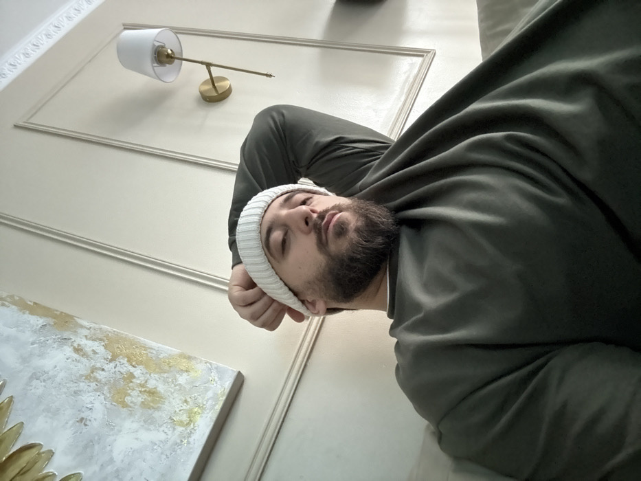 A bearded man wearing a white beanie and an olive-green long-sleeved shirt appears to be lounging indoors. His face is directed downwards towards the left of the frame. In the background, a framed painting with gold accents and a wall-mounted lamp are visible. Decorative trim adorns the wall.