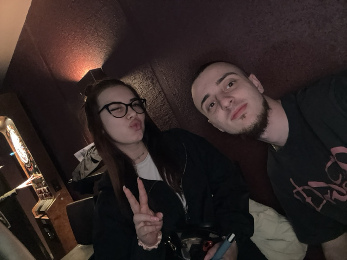 An indoor, dim-lighted selfie features two individuals