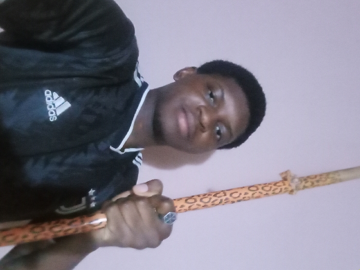 A young man is holding a leopard-print wand or staff