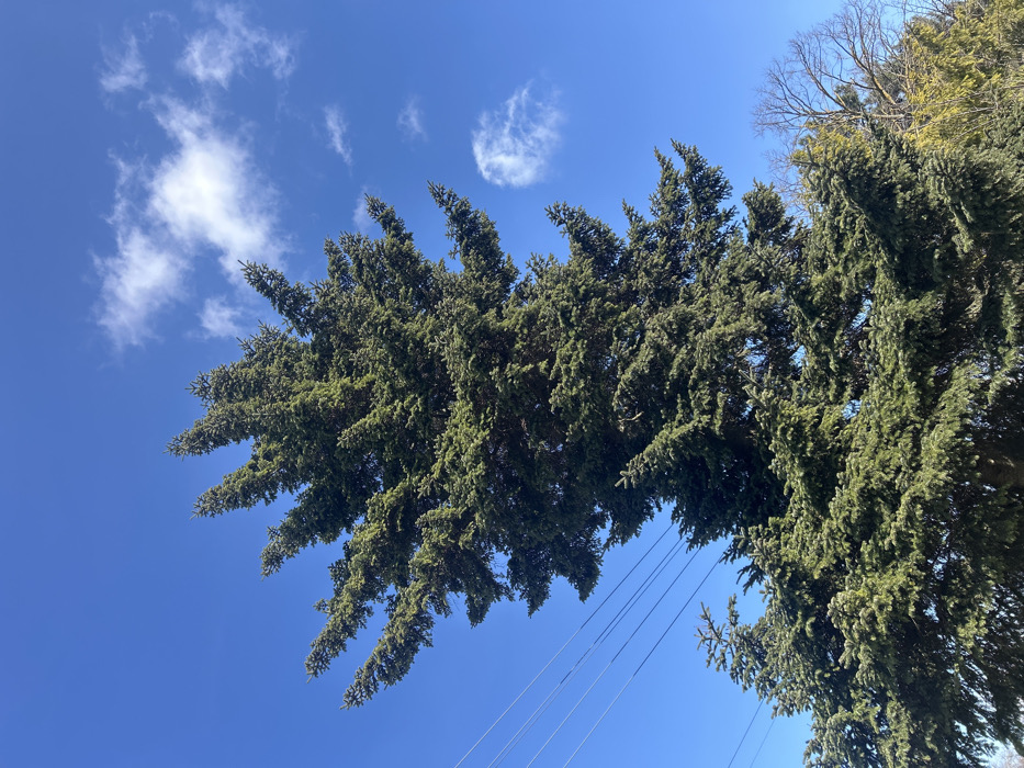 The image captures a tall, dense evergreen conifer, likely a spruce or fir, prominently positioned in the foreground and occupying the majority of the frame