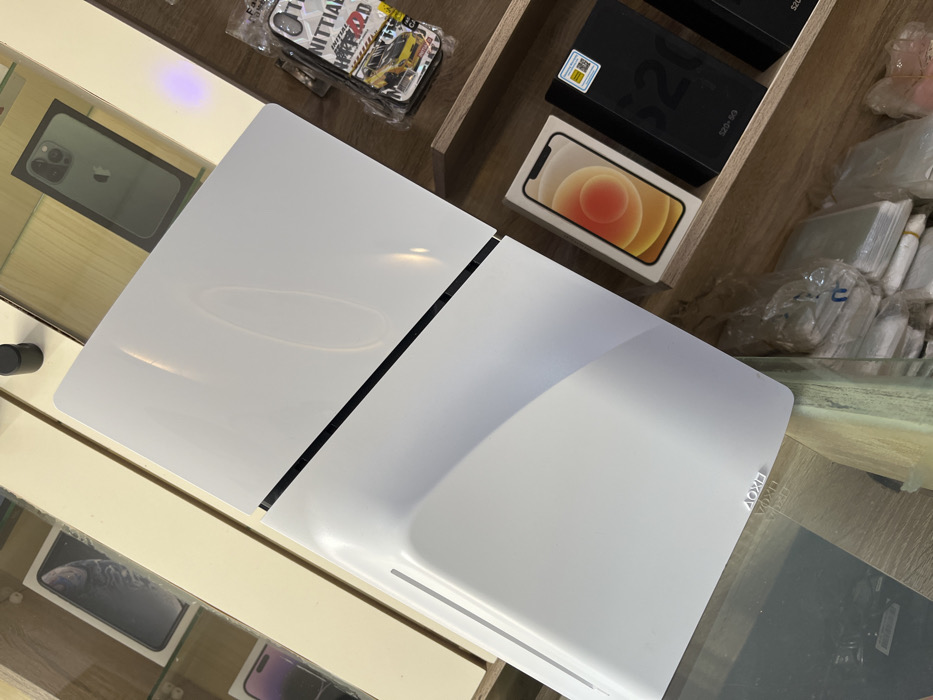 The image displays an electronics retail environment located in the city of Jos, Nigeria, captured from an elevated, slightly angled perspective. A white PlayStation 5 console (disc version) is centrally positioned on a reflective surface, likely a counter. To the upper left, within a glass display enclosure, several packaged iPhones are visible, including boxes for an iPhone 13 Pro and an iPhone 14 Pro. To the console's right, a clear plastic-wrapped smartphone case, featuring an 'INITIAL D' themed racing car graphic and 'RXT-D 420' text, is displayed. Below this, on a light-colored wooden shelving unit, an iPhone 12 box (depicting an orange circular graphic) is present alongside two black Samsung S20 5G boxes. One Samsung box bears a small white label with a QR code and 'SIM' text. The lowest visible shelf of this unit is stocked with numerous clear plastic-wrapped phone accessories. A small black cylindrical object is visible on an upper shelf in the background.