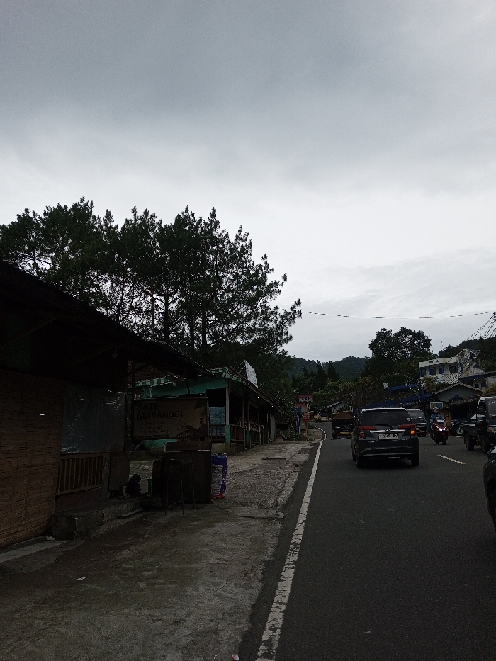 This image captures a roadside scene in the city of Adhanur, India, under an overcast sky. The perspective is directed along an asphalt road, which features a solid white line defining a paved shoulder on its left side. Traffic is observed moving away from the viewer in the right lane, consisting of a dark-colored SUV/MPV, multiple motorcycles, and other vehicles. On the left side of the road, a concrete sidewalk borders a row of single-story commercial structures with dark roofs. One establishment presents a sign displaying "SATE MARANGGI" in white lettering on a dark panel, set against a light blue-green facade. In front of this stall, a dark, squarish metal object, resembling a grill or utility stand, is positioned on the sidewalk, with a blue plastic item nearby. Behind these buildings, a dense cluster of tall evergreen trees, consistent with pine species, rises prominently against the sky. The background reveals undulating hills covered in foliage, situated beneath the uniformly grey, cloudy sky. No human figures are discernible within the frame.