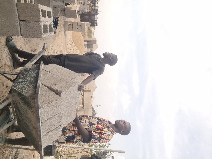The image depicts two adult males at an outdoor block-making or construction site in Makurdi, Nigeria, under an overcast sky