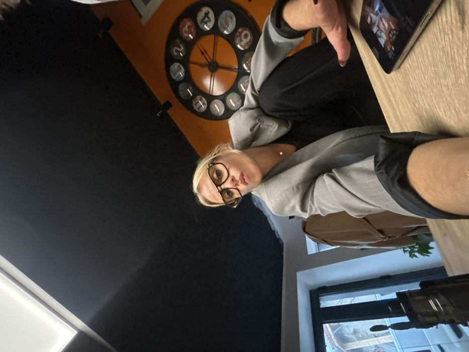 An indoor scene, described as being located in Saint-Médard-en-Forez, France, features a fair-skinned female subject posing for a photograph. The subject, positioned centrally, presents with blonde hair, dark-rimmed glasses, a light grey blazer over a black top, and black trousers. She faces the camera directly with a puckered-lips expression. A small, white circular pendant is visible on her necklace. Her left forearm and hand, displaying dark red nail polish, rest on a light wood-grain desk surface occupying the foreground. Her right arm is extended, consistent with holding the camera. To the right of the desk, a smartphone displaying a music player interface lies face-up. The background includes a dark-framed window on the left, partially revealing an indistinct exterior. A brown chair and a small green plant are partially visible near the window. The right side of the background features a large, decorative circular wall clock with a black face and stylized numerical plaques, mounted on an orange wall. Two black track lights are positioned above the clock. The ceiling is dark grey or black, with a white linear light fixture visible in the upper left corner.