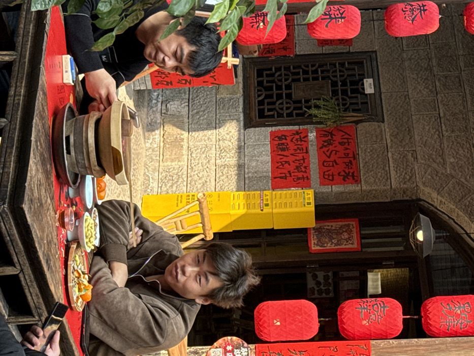 Two men are seated at a table laden with food and a hot pot setup. Red lanterns and traditional Chinese calligraphy decorate the exterior of the building. A yellow object, possibly a box or container, sits behind one of the men. The building's facade is stone, with a window and doorway visible. One man is actively tending to the hot pot while the other is reclining with his arms crossed.
