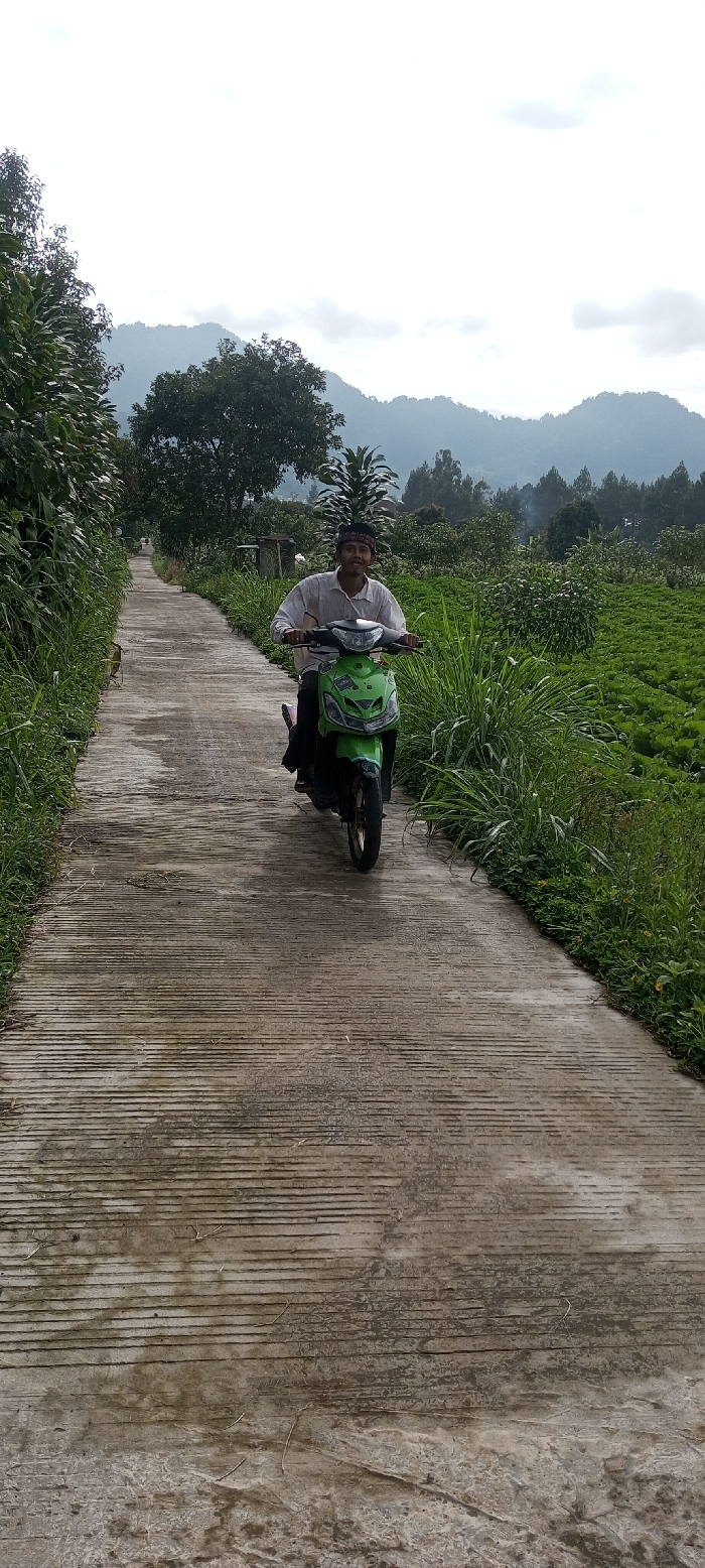 A man rides a green scooter down a concrete road. The road is lined with vegetation on both sides, including tall grasses and leafy plants. In the background, there are rolling hills and a cloudy sky. The road has ridges etched into its surface. The man is wearing a light-colored shirt and has a dark headband on.