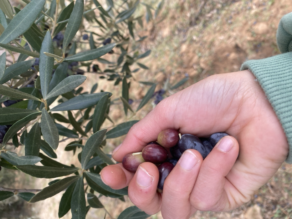 - "A close-up image captures a light-skinned human hand holding approximately 10-15 olives of mixed ripeness, displaying dark purple, reddish-purple, and greenish hues" by FM-VKGKm1, licensed under CC BY 4.0