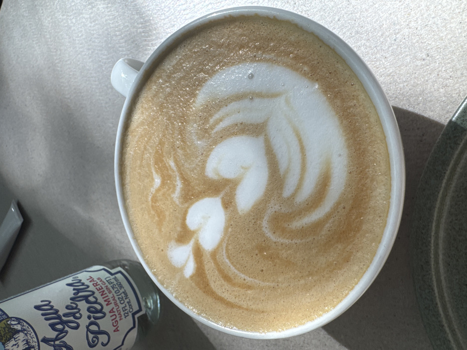 The scene depicts a tabletop setting under strong, directional lighting, casting distinct shadows. The primary subject is a white ceramic coffee cup containing a latte, prominently displaying intricate latte art. The latte art features two heart-shaped designs in the upper left, leading into a multi-lobed, symmetrical leaf-like pattern towards the center-right, all rendered in off-white foam against the light brown coffee. In the upper left background, a clear glass bottle of "Agua de Piedra" mineral water (Natural sin Gas, 12 Fl. Oz, 350 mL) is visible, partially obscured by a shadow. Behind the water bottle, a small, white, rectangular packet, likely a sugar or sweetener packet, is partially discernible. A segment of a dark green or grey ceramic plate with concentric ridges is visible in the lower left foreground, underneath the coffee cup. The objects rest on a light grey, textured surface, possibly a stone or laminate tabletop. No individuals are present. The location is in the city of San Pedro Garza García, Mexico.