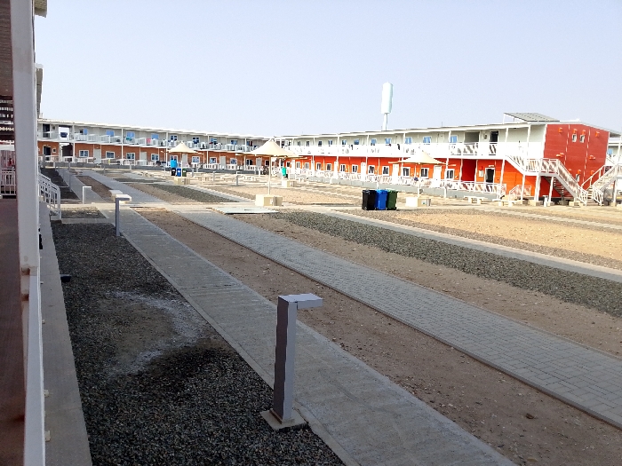 This image depicts a modular living facility in Hanak, Saudi Arabia, characterized by rows of two-story prefabricated buildings arranged around an open central area