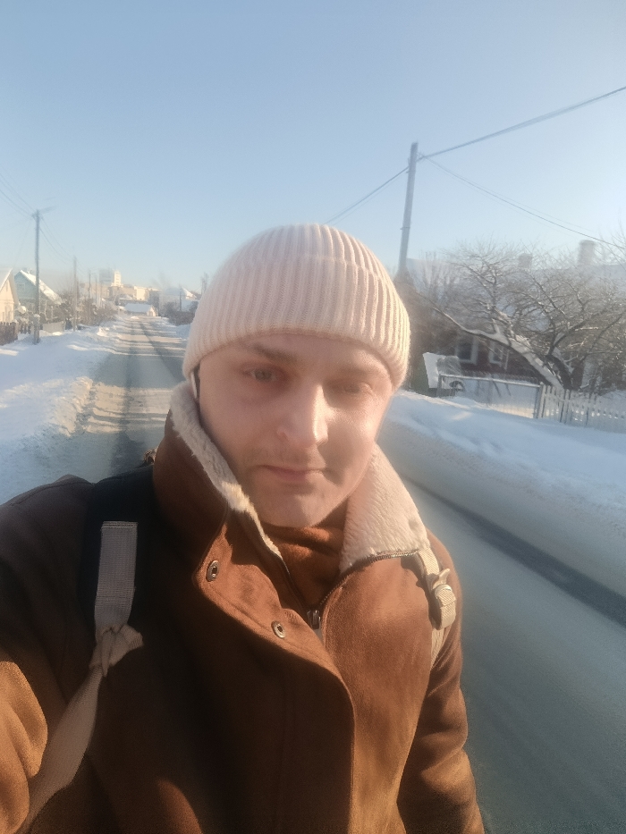 A male individual, appearing to be between 20 and 35 years old, is depicted in a chest-up selfie format, centered in the foreground. He has light-colored eyes, fair skin, and a light mustache with stubble. He is wearing a light beige ribbed knit beanie and a brown winter jacket with a cream-colored fleece or shearling collar visible. A darker brown garment with a high collar is visible beneath his jacket. A light grey strap, possibly from a backpack, is visible over his right shoulder. The subject maintains a neutral expression, looking directly at the camera. The scene is set outdoors on a clear, sunny winter day in Hlybokaye, Belarus, under a bright blue sky. A snow-covered residential street extends uphill into the background, with the road surface appearing partially cleared, wet, or icy. Snow banks line both sides of the road. On the left side of the street, snow-covered wooden fences and several single-story houses with snow-laden roofs are visible, accompanied by utility poles with overhead wires. In the distant background, a prominent building with a tower or spire is discernible, suggesting a town center landmark. On the right side, a snow-dusted picket fence, a bare tree heavy with snow, and a darker-colored multi-story building are present, also with utility poles. The ground and all exposed surfaces are covered in a layer of snow.