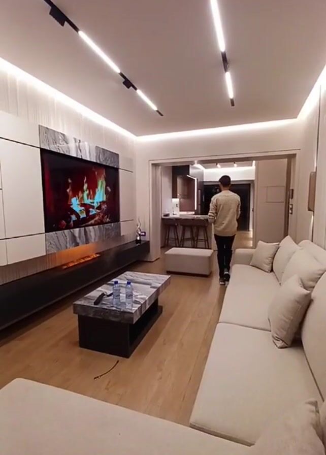 The video depicts a modern living room leading to a kitchen space. A person wearing a beige shirt and dark pants walks from the living room into the kitchen. The living room has light wood floors, a long white sectional sofa with multiple pillows, a gray and black marble-patterned coffee table with two water bottles on top, and a large TV mounted on a wall with a decorative marble frame and a fireplace effect display. The lighting is bright, provided by strip lights on the ceiling. The kitchen features a counter with bar stools and is visible through a wide doorway.