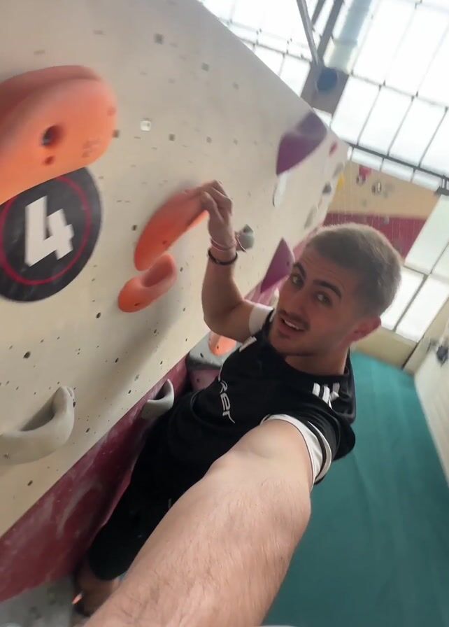 - "A young man with short, bleached hair and a black shirt with white stripes is hanging onto a climbing wall at an indoor climbing gym" by FM-BRTx72, licensed under CC BY 4.0