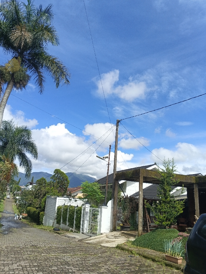 The image displays a residential street scene in Đà Nẵng, Vietnam, under a bright blue sky with scattered white cumulus clouds. A paved uphill road, constructed from dark grey interlocking pavers, occupies the lower portion of the frame, showing some surface debris. On the far left, a tall palm tree with green fronds extends from the lower left to the upper left quadrant. Further up the road on the left side, two indistinct figures are visible on the roadside. A white perimeter wall with a white metal gate and an adjacent green hedge borders the left side of the road, behind which parts of white-walled houses with dark roofs are visible. In the center-right, a wooden utility pole supports multiple black overhead power lines and features an attached street light fixture. To the right of the pole, a white-walled house with a dark tiled roof is visible, fronted by a concrete pergola-like structure showing some natural growth. A small evergreen tree stands near this structure. In the immediate bottom right foreground, a planter containing green plants (possibly green onions) is present, along with a partial view of a dark-colored vehicle. In the background, green, tree-covered mountains are visible beneath the partly cloudy sky.