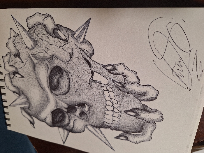 - "This image displays a black ink drawing of a stylized, macabre skull on white, spiral-bound paper, observed in Simitli, Bulgaria" by FM-MFJR42, licensed under CC BY 4.0