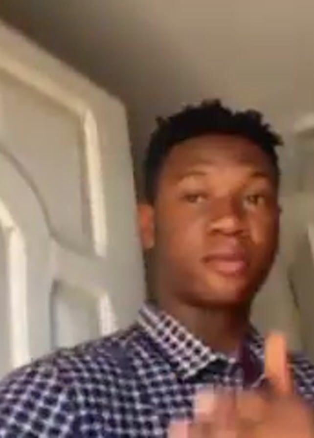 A young man with short, dark, tightly curled hair is holding the camera and filming himself