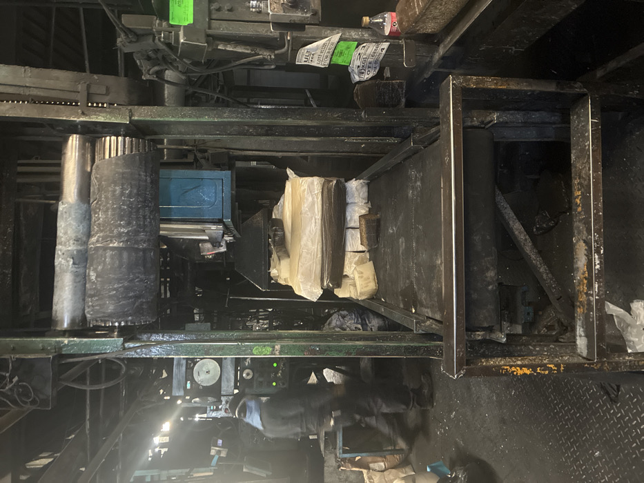 This image depicts an industrial interior, stated to be located in Cuautitlán Izcalli, Mexico. The central focus is a robust, dark green/grey metal-framed industrial conveyor system. On the conveyor belt, a stack of rectangular material blocks is visible; the upper blocks are light-colored and wrapped in clear plastic, while lower blocks are darker and appear denser. Above the conveyor, large cylindrical rollers, coated with dark residue, are positioned, suggesting a material processing function. To the left, a single individual is partially visible, blurred by motion. This person wears dark industrial clothing, dark footwear, and a light blue face covering over their mouth and nose, along with a dark head covering. They are positioned near an industrial control panel featuring gauges and illuminated green indicator lights. The background reveals more industrial machinery, pipes, and structural elements. A turquoise-colored rectangular component is visible on the right. Several paper labels, one prominently displaying "ULT KGS LOTE," are affixed to a vertical support on the right side of the frame. A small plastic bottle containing a pink liquid rests on a dark surface to the right. The floor beneath the person consists of a dark, diamond-plate metal surface, transitioning to a darker, uneven floor further right. Illumination is dim, with some bright light sources originating from the upper left.