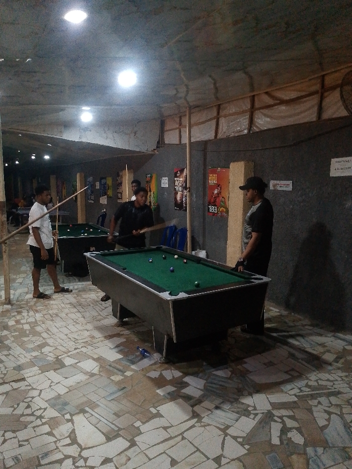 Inside a dimly lit pool hall with a mosaic tile floor, three men are playing billiards. Two pool tables sit side-by-side. One man stands with a pool cue poised to strike. Another man, wearing a white shirt, observes. A third man in a baseball cap stands near the second table. Posters decorate the walls, and bamboo poles support the ceiling.