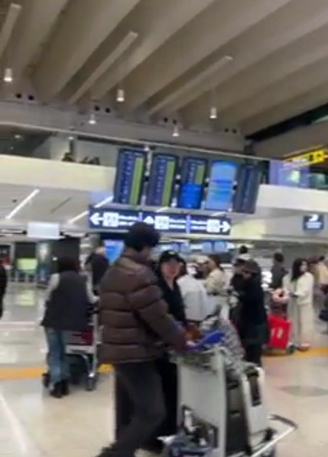 interior of a busy airport terminal. Many travelers are visible, most with luggage carts or pulling suitcases. They are moving along a yellow guiding strip on the floor. Above the crowd are digital boards displaying flight information. Signage for check-in areas and airline ticket offices is visible. The terminal has a high ceiling with recessed lighting and a second-floor balcony.