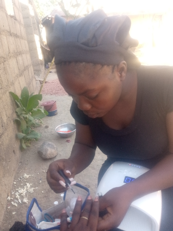 A woman in a black headscarf and shirt is focused on doing nails. She holds a brush and applies a coat to the extended, manicured nails of a client. An open nail kit with tools is nearby. A white UV nail lamp is also visible. The scene is outside on the ground next to a brick wall with foliage. A metal bowl and paint can are in the background.
