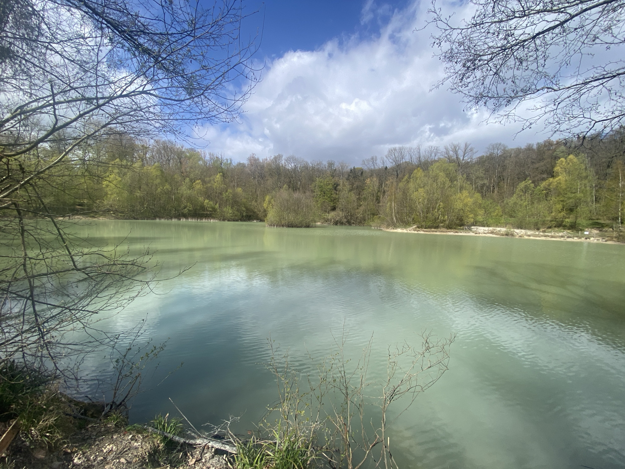 view of the Étangs de Saint-Martin-du-Tertre, located in Saint-Martin-du-Tertre, France. The lake fills much of the frame. The water has a pale green-gray color. The surface is textured with small ripples, reflecting the sky. The water level appears to be moderately high. Trees line the far bank of the lake, with foliage ranging from bare branches to budding green leaves. Tree branches are visible in the foreground. The sky is visible through the trees and above the lake. It's a blue sky with some puffy white clouds. The foreground is a muddy shoreline with some exposed roots, grass and other vegetation.