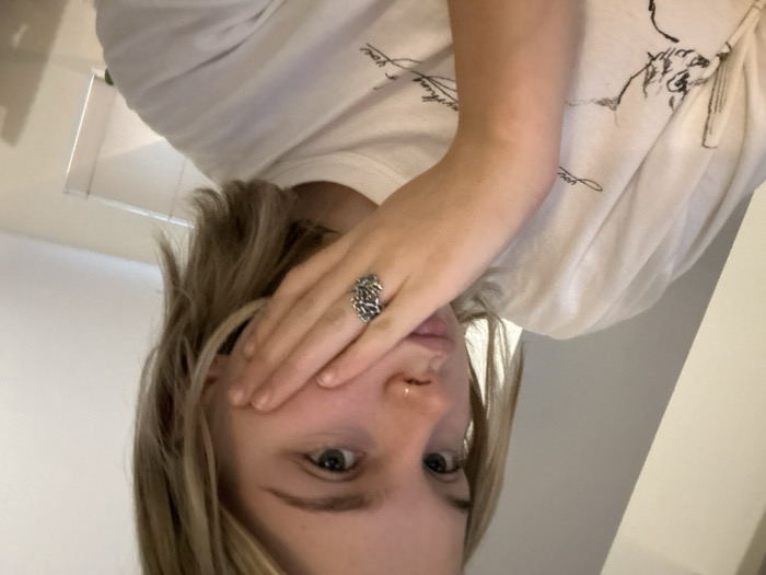 A person with blonde hair partially covers their face with their hand, on which they wear a silver ring. They are wearing a white shirt with a design on it. The photo is taken at an angle, so the person's head is tilted to the left. The background is a light color and includes a doorframe and a light fixture.