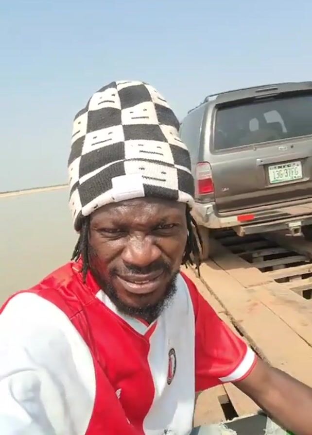A man wearing a red and white soccer jersey, a black and white checkered beanie, and ripped jeans sits on a wooden platform. He faces the camera with a slight frown. A car is parked behind him on the platform, and a body of water extends into the background. Another person can be seen in the background, also on the platform. The scene appears to be outdoors during daylight hours.