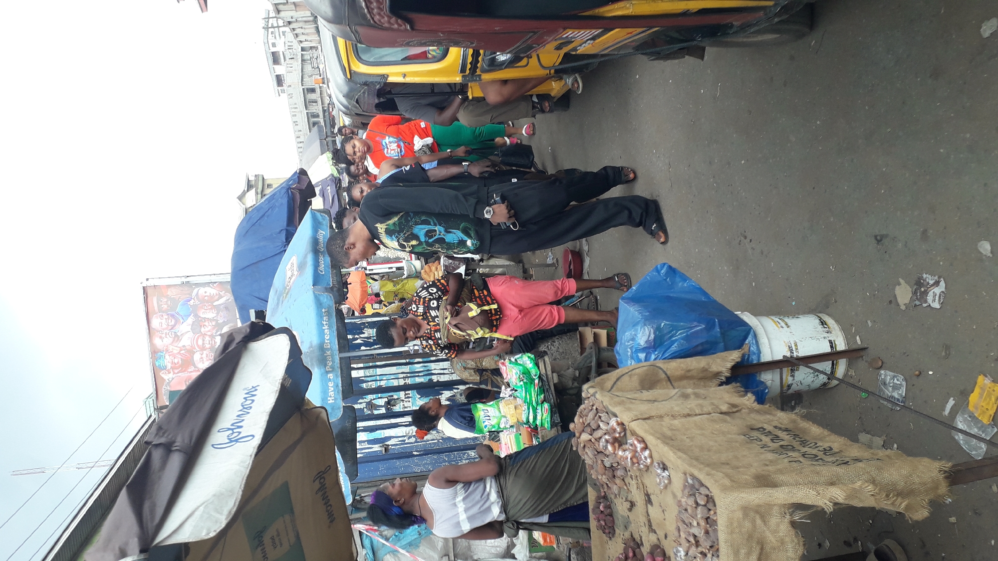 This image shows a bustling street scene in Onitsha, Nigeria. Several people are visible, engaged in various activities: buying, selling, and walking. A yellow commercial tricycle, known as a "keke," is parked on the street. The street is filled with vendors, their goods displayed on tables and under umbrellas. Items for sale appear to include sacks of onions, prepackaged food items, and other goods. The street surface is paved and appears to be well-worn. Several brand names are visible on the vendors' stands including, "Johnson," and "Peak Breakfast." A large billboard with faces on it stands in the background.