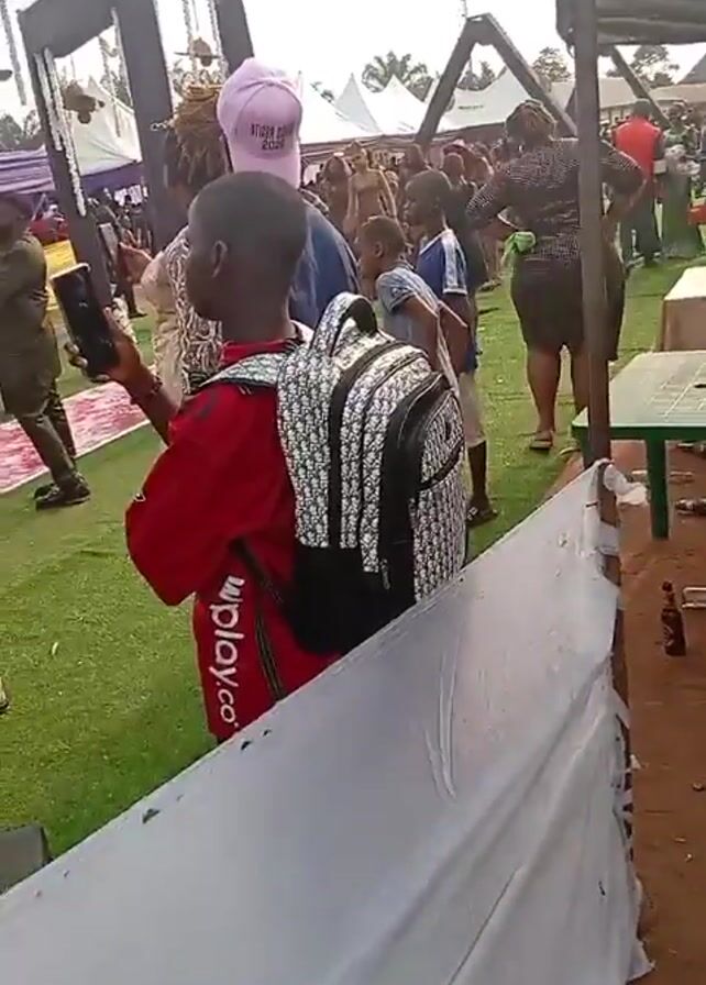 crowd of people gathered at an outdoor event, likely a party or celebration, on what appears to be artificial turf. In the foreground, a young person wearing a red shirt and a Dior backpack is taking photos with a phone. Scattered around the base of a large black speaker are numerous paper bills. People are interacting with the money, picking it up and distributing it. There is a tent-like structure nearby, along with tables and other event decorations. The overall atmosphere suggests a lively, festive occasion.