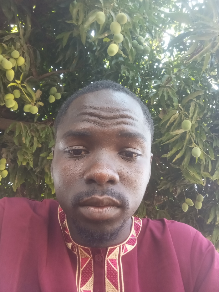 A medium close-up photograph depicts an adult male outdoors in Lafia, Nigeria. The subject, positioned centrally, has dark skin, short dark hair, and a short, dark beard and mustache. He is wearing a maroon long-sleeved tunic with intricate gold and red geometric embroidery along the collar and front placket, which includes three visible buttons. His expression is neutral, with his gaze directed forward towards the camera. The background consists of dense green foliage belonging to a mango tree, visible behind and above the subject's head, with numerous clusters of light green, unripe mangoes clearly identifiable among the leaves. The scene is illuminated by natural daylight.