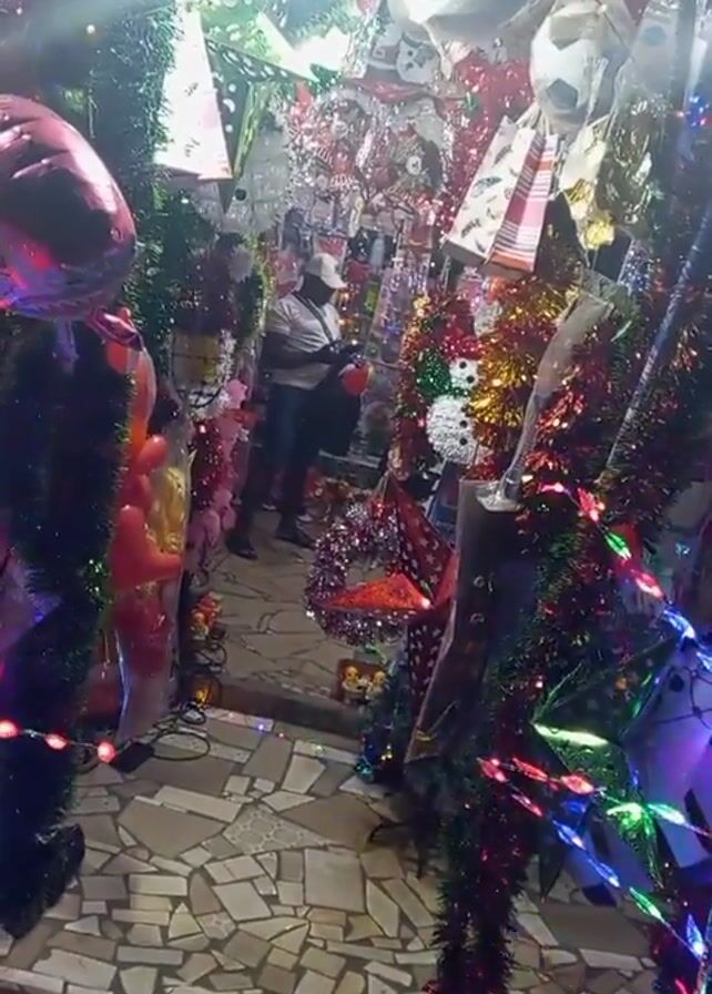 entrance to a shop selling Christmas decorations. The entrance is surrounded by green tinsel and colorful string lights. Inside the shop, various Christmas decorations are displayed, including snowmen, wreaths, ornaments, and what appears to be a Spiderman toy and a pink rabbit toy. Two people, one wearing a red shirt and the other wearing a white hat, can be seen inside the shop. The floor in the entrance area is covered with light-colored, mosaic-style tiles.