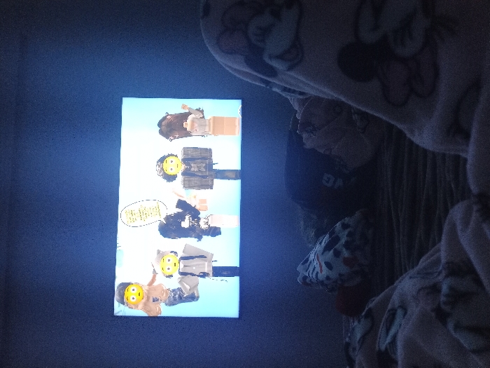A bright screen displays an image with cartoon figures, each bearing a yellow emoji face