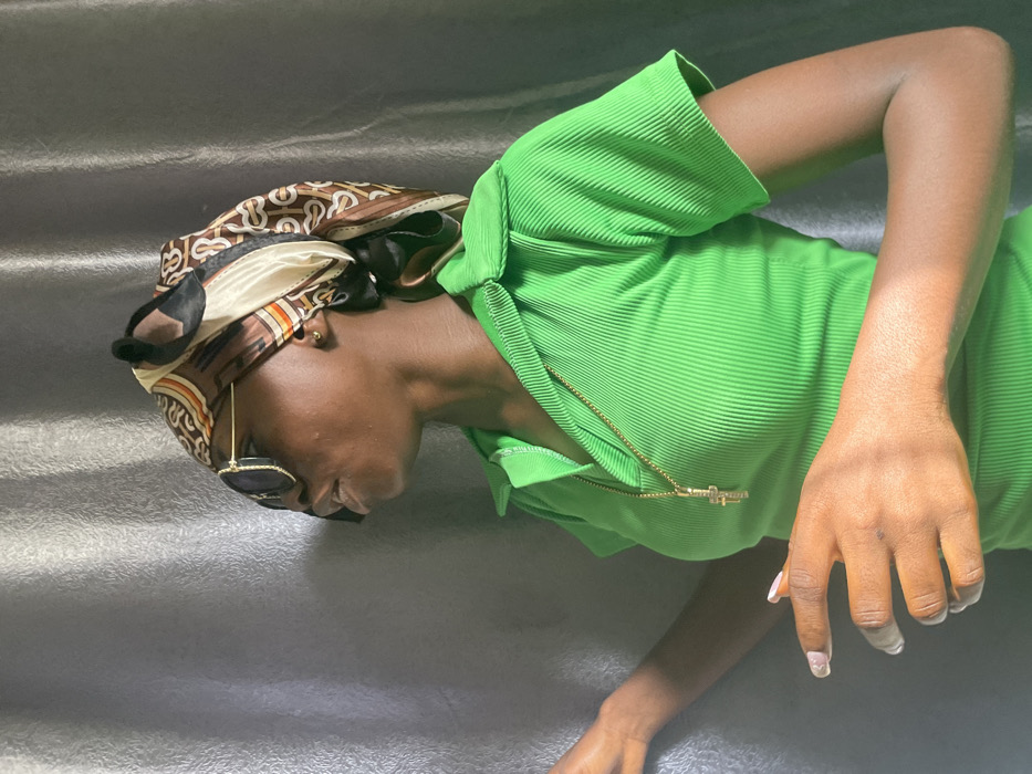 A woman lies on a textured gray surface, wearing a bright green, ribbed dress with a zip-up front. A patterned headscarf covers her hair, and round sunglasses obscure her eyes. A gold necklace with a cross pendant hangs from her neck. Her hands rest near her body, revealing a light manicure. The image is well-lit and the color palette is vibrant with a stark contrast between the green and gray.
