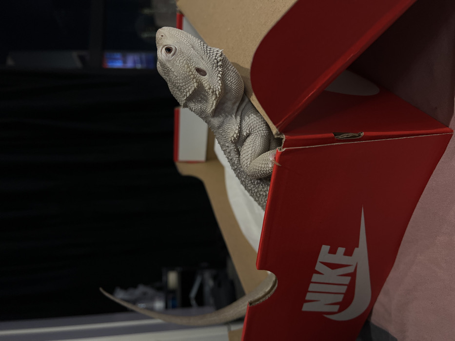 A pale, scaly bearded dragon (Pogona vitticeps) is positioned inside an open red Nike shoe box