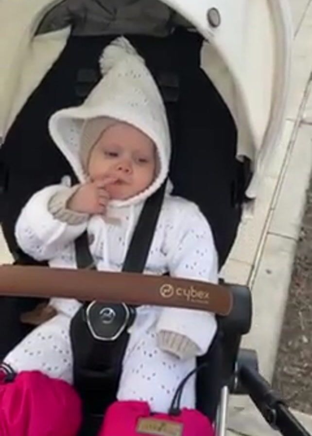 A baby is seated in a Cybex stroller on a paved surface. The baby is wearing a white knitted outfit including a hat with a pointed top. The baby has their finger in their mouth and is looking forward. Two bright pink bags labeled "Little Baby" are attached to the front of the stroller. The stroller has a white canopy and a brown handlebar. A sidewalk and some sparse vegetation are visible in the background.