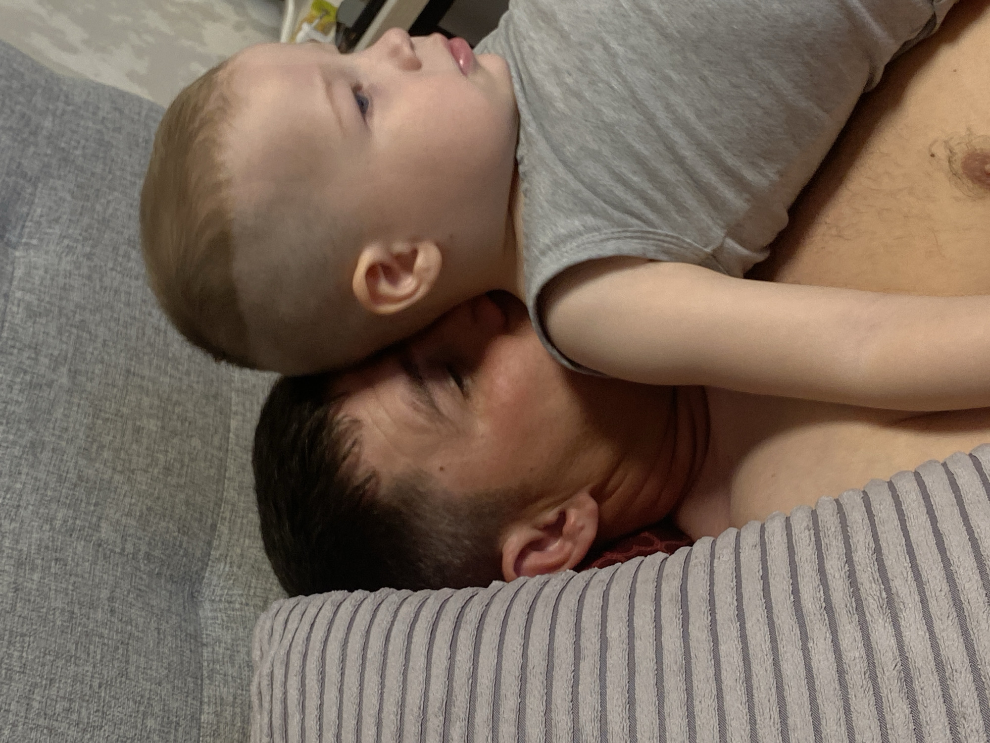 - "A toddler is lying on top of a man's torso on a couch with a gray cushion" by FM-GaWow1, licensed under CC BY 4.0