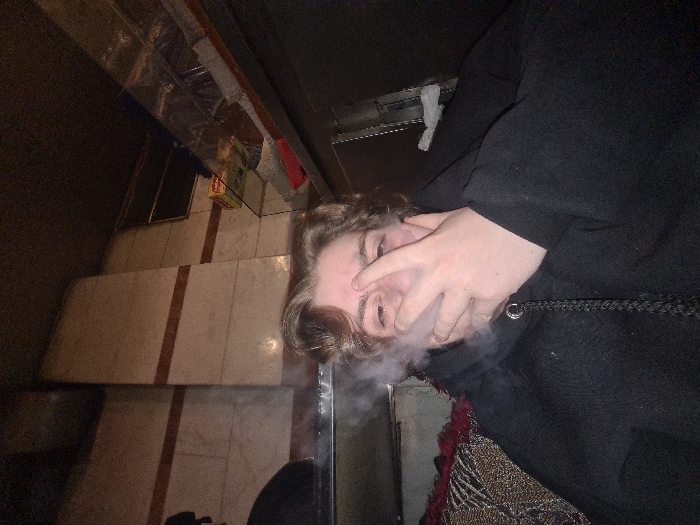 This image depicts an indoor, dimly lit scene within the Sarouja Municipality, Syria. A single individual with light, wavy hair, wearing a dark hooded garment, is prominently featured, looking directly towards the viewer. Their right hand is raised, partially obscuring the lower portion of their face, with white smoke emanating from the area around their mouth and hand. A black braided cord, consistent with a shisha hose, is visible draped around their neck/chest, passing under their right hand. To the left, patterned upholstery in dark red and black is partially visible, suggesting seating. The background features light-colored, possibly off-white, tiled walls with horizontal dark brown accent stripes. A vertical tiled column is visible in the mid-background. On the right, a transparent glass shelf holds a yellow box and other indistinct items, situated above a dark counter-like surface. The overall environment suggests a casual establishment, possibly a cafe or lounge, with low ambient lighting.