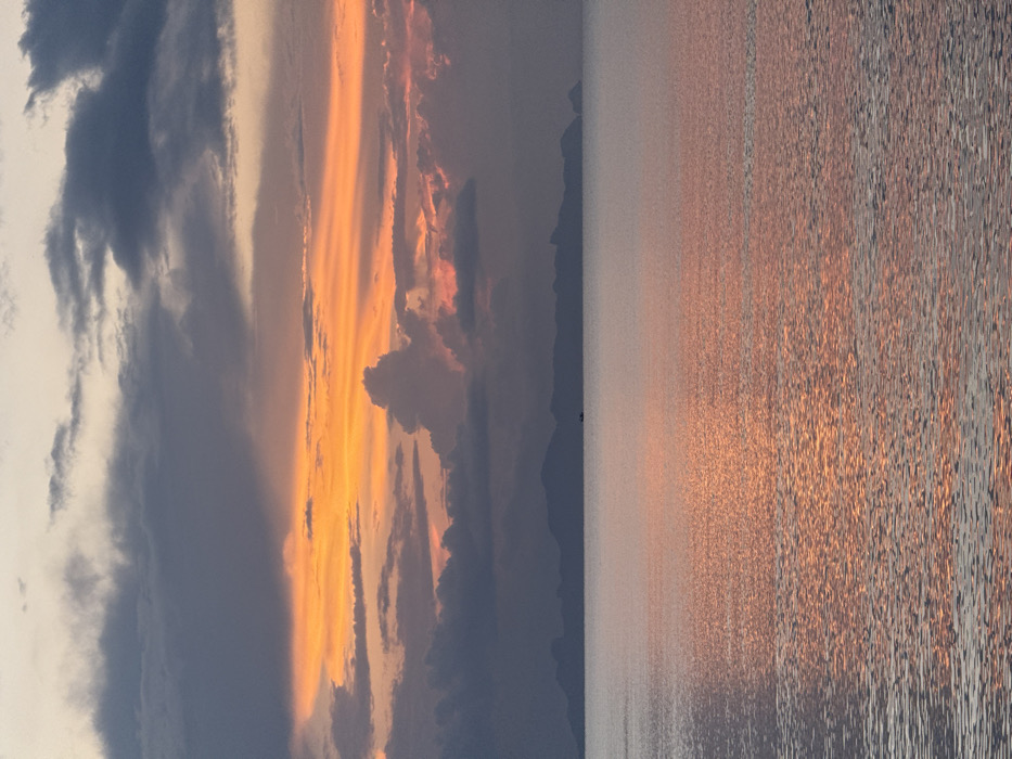 The scene depicts a coastal landscape at sunset in Tong Yang, Thailand. The sky occupies the upper portion, characterized by dark grey stratocumulus clouds in the uppermost section. Below these, a prominent horizontal band of vibrant orange and yellow light signifies a sunset, with additional cumulus clouds illuminated in shades of pink and orange. A distinctive, tall, and narrow cloud formation resembling a plume is visible against the brightest orange light, slightly left of center. A dark, undulating silhouette of distant mountains or islands forms the horizon line. The lower half of the image comprises a body of water, likely a sea or ocean, which reflects the warm hues of the setting sun, creating shimmering patterns of orange, pink, and light grey across its surface. A single, small, dark vessel is present on the water, positioned just above the horizon line, slightly to the right of the image's vertical center, appearing as a solitary object. No individuals, explicit actions, or interactions are visible within the frame.