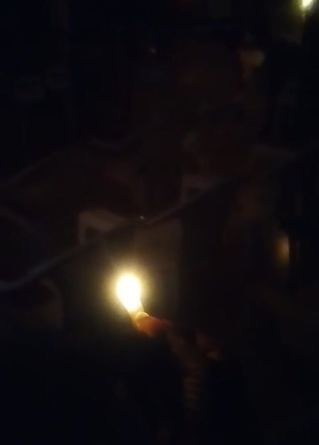 A dimly lit scene shows a hand holding a lit match. The background reveals rows of white, plastic chairs, possibly in an outdoor setting. Distant streetlights or similar light sources are visible, but most of the surroundings are in darkness. A person walks in the background, partially visible.