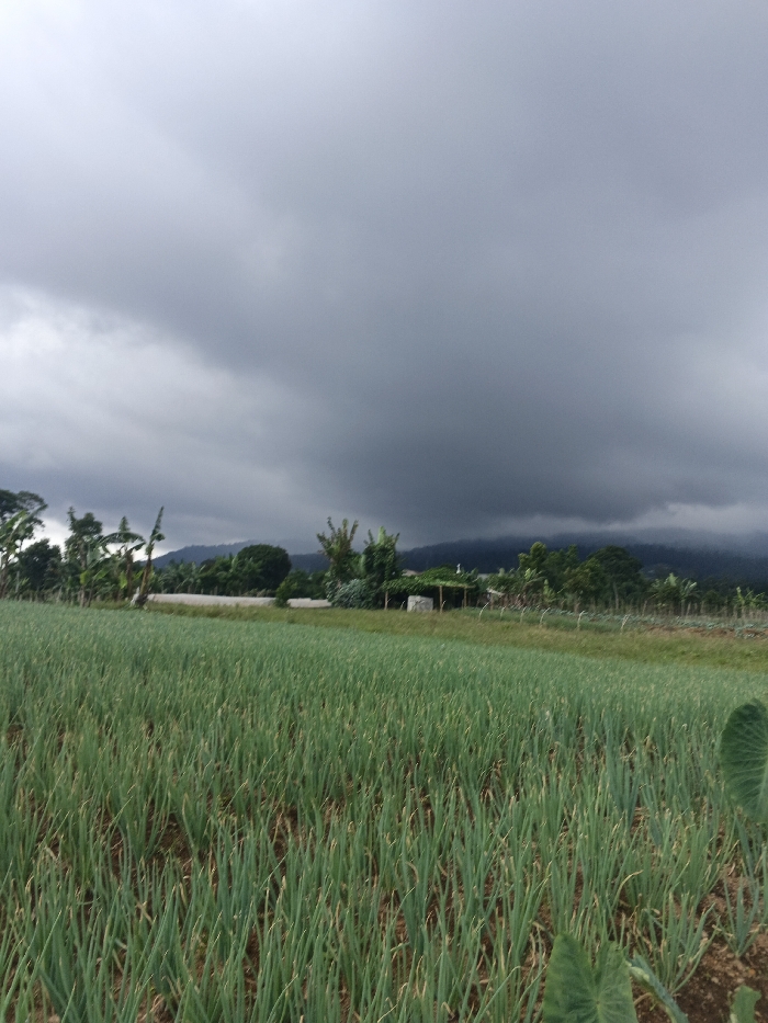 The image depicts an agricultural landscape within the city of Pô Kô, Vietnam, under a heavily overcast sky. In the foreground, a cultivated field occupies the lower half of the frame, showcasing numerous rows of green, upright plants resembling young onions or leeks. Exposed soil is visible between the plant rows. On the extreme right, a large, dark green, heart-shaped leaf, consistent with taro, is partially visible. The midground features a narrow, unpaved strip separating the cultivated field from a line of dense vegetation and trees, including several banana trees with broad leaves. A small, rudimentary shelter with a dark tarp roof supported by poles is positioned among the trees on the right side of the midground. To the left within the midground, a light-colored, possibly concrete, low-rise structure or wall is partially visible. The background consists of a dark, undulating mountain range, densely covered in vegetation and partially obscured by atmospheric haze or low-hanging clouds. The sky, dominating the upper portion of the image, is filled with thick, dark grey cumulonimbus or nimbostratus clouds, indicative of an imminent storm or heavy overcast conditions. No individuals, animals, or vehicles are present.