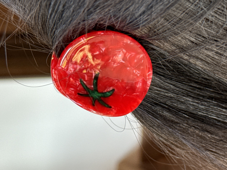 A close-up image captures a section of dark, fine hair, possibly black or dark brown, with individual strands visible. A circular, glossy red hair accessory, approximately 2-3 cm in diameter, is affixed to the hair on the right side of the frame. The accessory features an opaque green, star-shaped design on its surface, mimicking a tomato's calyx. The red material exhibits a marbled or textured pattern beneath its clear, reflective top layer. The background is uniformly light and out of focus on the left, transitioning to a darker, indistinct blurred area on the right, suggesting an indoor environment. No specific features within the image indicate a precise location in the city of Otego, United States.