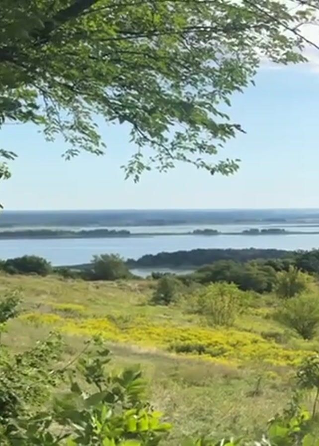 The camera pans from a tree to a beautiful view of a lake surrounded by trees and a field of yellow wildflowers. The sky is light blue with puffy white clouds. The sun is shining and glints off the surface of the water. The view is from an elevated position, looking down on the scene. People can be heard in the background.