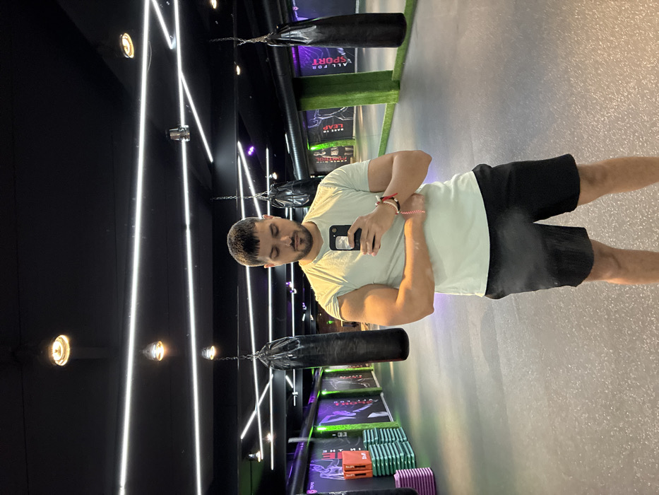 A male subject, estimated to be in his 20s or 30s, with short dark hair and a beard, is standing in what appears to be a gym or fitness center