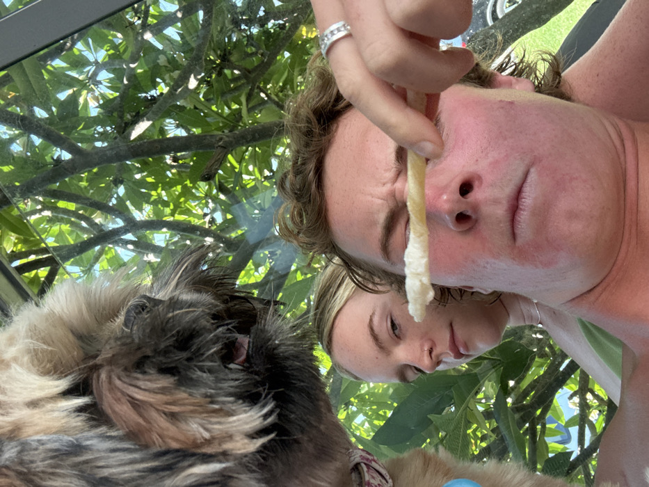 A low-angle shot shows a man holding up a treat, possibly a bully stick, to his face. He wears a ring on his finger. A woman's face is partially visible in the background. A dog's face is in the lower left corner. Trees and sky are visible through what appears to be a window or glass roof. The scene has a casual, playful atmosphere.