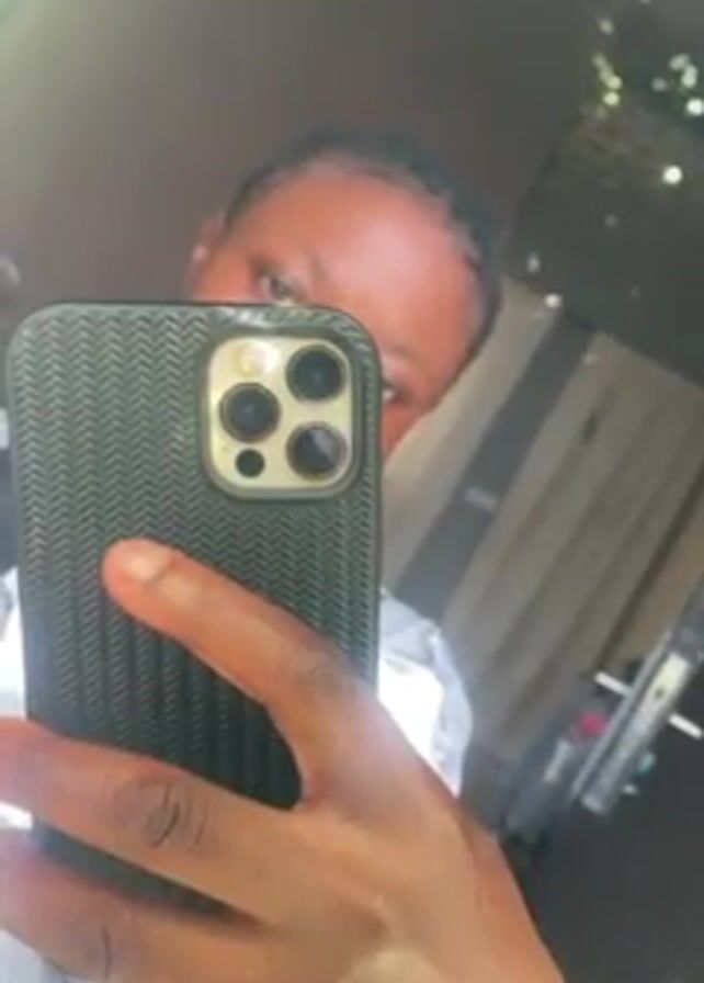 A person with dark skin and short black hair is holding a smartphone in their left hand, taking a selfie in a mirror. The smartphone has a black textured case and a multi-lens camera system. The person is looking at the camera, and briefly smiles. The reflection in the mirror shows the person from the shoulders up. The background appears to be a room with a window, a curtain, and possibly some exercise equipment.